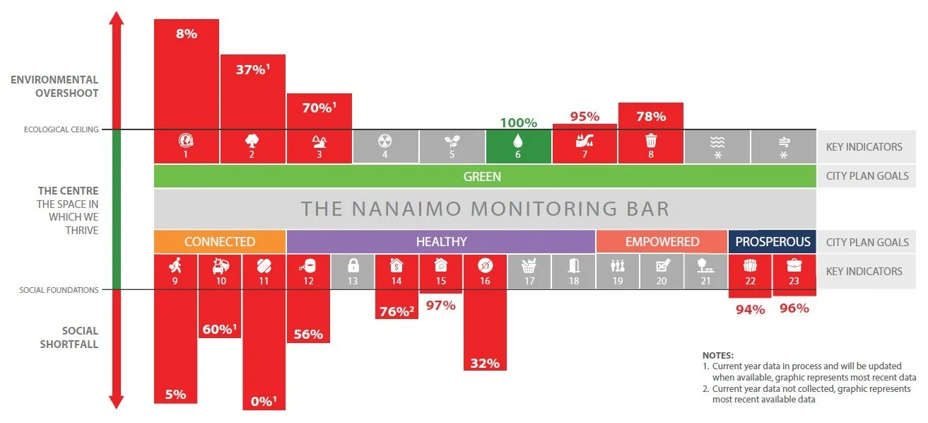 Nanaimo is the only city in Canada, possibly North America, to have formally adopted Doughnut Economics as its operating model. The framework is the basis for the City Plan and informs the monitoring strategy the city uses to understand, and take action, on key well-being metrics. The Nanaimo Monitoring Bar (Nanaimo Bar… get it?) tracks a range of metrics from GHG emissions to water use to community safety. This is Nanaimo’s first step in ensuring we play our part in reducing overshoot, while ensuring our citizens’ needs are met.